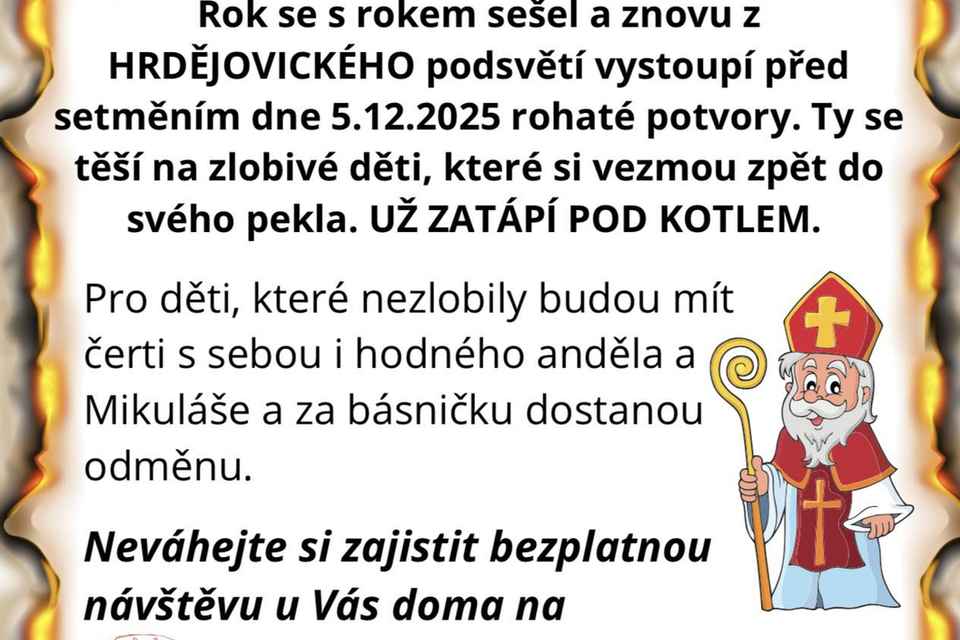 V pátek 5. prosince se opět otevřou pekelné brány a čerti společně s Mikulášem a andělem navštíví hrdějovické děti!
