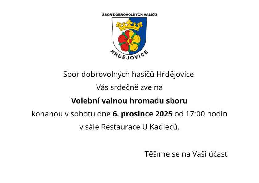 Sbor dobrovolných hasičů Hrdějovice Vás srdečně zve na letošní Volební valnou hromadu sboru, která se bude konat v sobotu dne 6. prosince 2025 od 17:00 hodin v sále Restaurace U Kadleců.